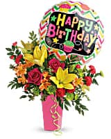 No birthday bash is complete without a surprise delivery of beautiful blooms! This festive bouquet of hot pink roses and sunny yellow lilies is topped with a fun Happy Birthday balloon for a gift they'll never forget.