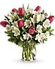 Romance buds in the spring - and it blooms beautifully in this charming bouquet of tulips and alstroemeria. Presented in an elegant hurricane vase, it's a heartfelt gesture she'll remember through all seasons.