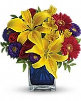 Martinique, St. Maarten, any tropical paradise is the perfect setting for this explosively colorful bouquet in a chic blue contemporary cube vase. Can't go just now? Bring the island home.