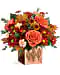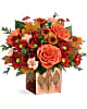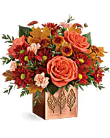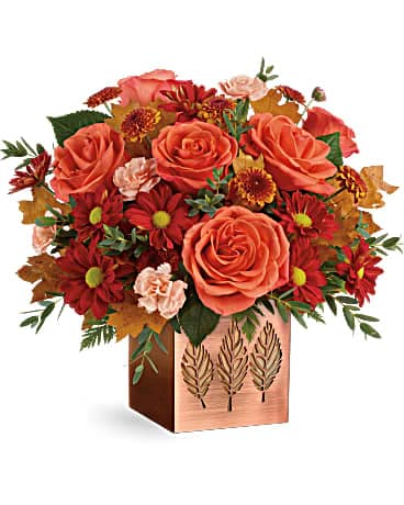 This gorgeous metal cube is finished with a copper-painted glaze with a punched leaf design, perfect filled with fall blooms or as a candle holder! Available exclusively from Teleflora.