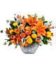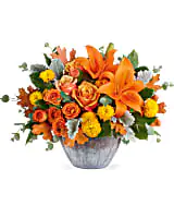 A bounty of beauty for all your fall festivities! Bursting with awe-inspiring orange roses and lilies, this golden bouquet is arranged in a stunning, oven-to-table serving bowl with artisanal steel blue glaze.
