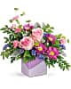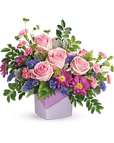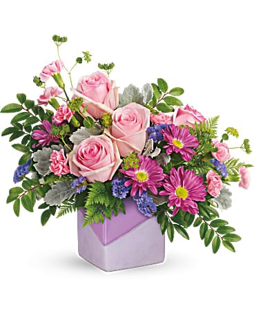 An artistic gift, this lavender two-toned ceramic cube is both matte and shiny is part of Teleflora's exclusive Flowers-in-a-Gift collection. A gift this unique is perfect for Mother's Day and will be cherished for years to come!
