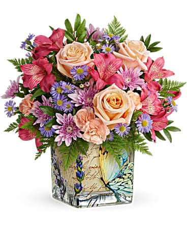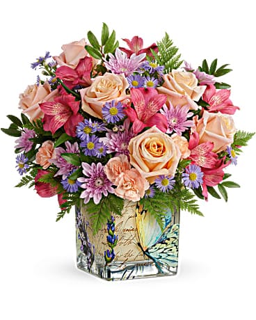 A whimsical gift she'll never forget, this lush pastel bouquet is presented in a keepsake cube with vintage butterfly motif. Two gorgeous gifts in one!
