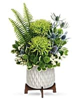 Available exclusively from Teleflora, this glazed ceramic pot with semi-gloss finish and wooden stand will be the perfect home or office décor piece for years to come.
