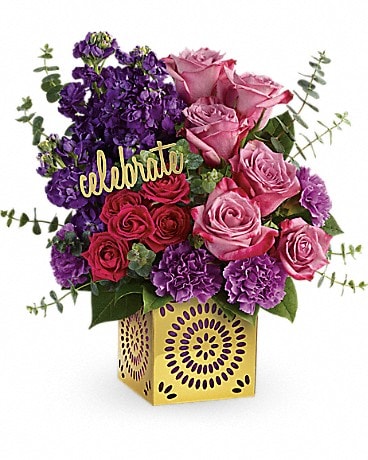 Available exclusively from Teleflora, this shimmering, golden metallic cube with intricate cutouts later transforms into a gorgeous candleholder!