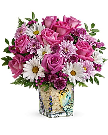 A whimsical gift she'll never forget, this lush pastel bouquet is presented in a keepsake cube with vintage butterfly motif. Two gorgeous gifts in one!