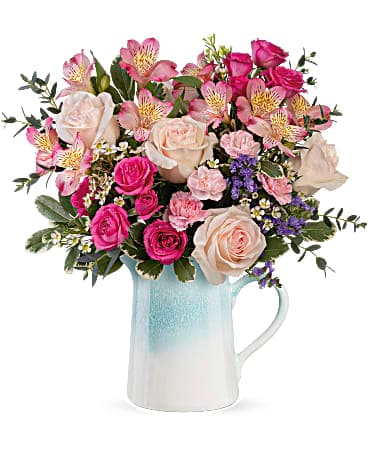 Washed in a fresh aqua glaze, this modern stoneware pitcher is the perfect partner for mom's favorite mix of pale pink roses and blooms!
