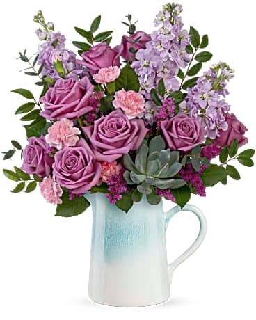Washed in a fresh aqua glaze, this modern stoneware pitcher is the perfect partner for mom's favorite mix of pale pink roses and blooms!