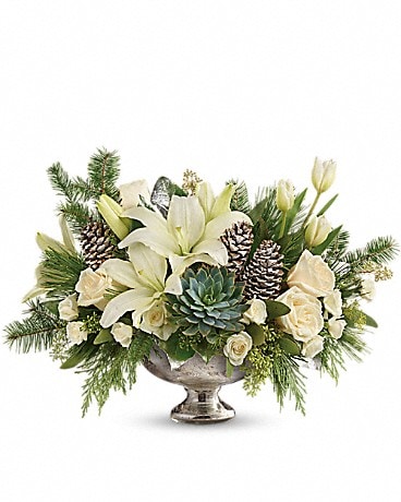 This antiqued mercury glass pedestal bowl is from Teleflora's exclusive Flowers-in-a-Gift collection. This stunning keepsake will be enjoyed for years to come.