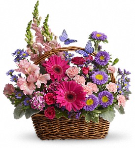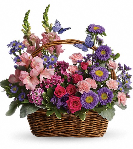 Hot pink spray roses, light pink alstroemeria, snapdragons and miniature carnations, dark pink Sweet William, purple matsumoto asters, large monte cassino asters, statice and pittosporum fill a pretty picnic-like basket. You've got this gift handled!Approximately 16 1/2" W x 16 1/2" H