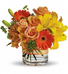 Light orange roses and alstroemeria, yellow asiatic lilies and orange gerberas are delivered in an organza ribbon-wrapped cylinder vase. Siesta or fiesta - it's all good.Approximately 11 1/2" W x 10" H