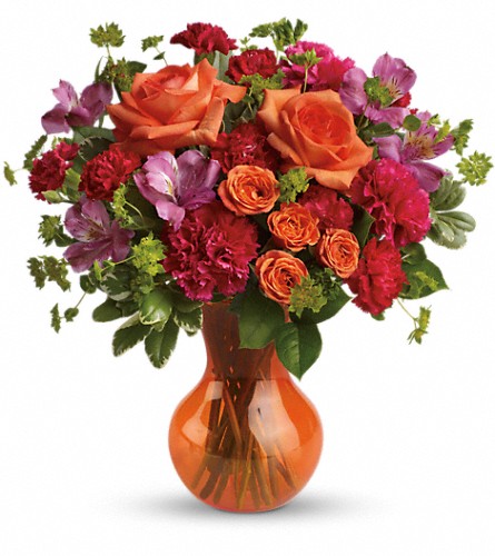 Orange roses, pink alstroemeria, dark pink carnations and miniature red carnations are accented with fresh bupleurum, lemon leaf and variegated pittosporum. Delivered in a Serendipity vase.Approximately 14 3/4" W x 15" H