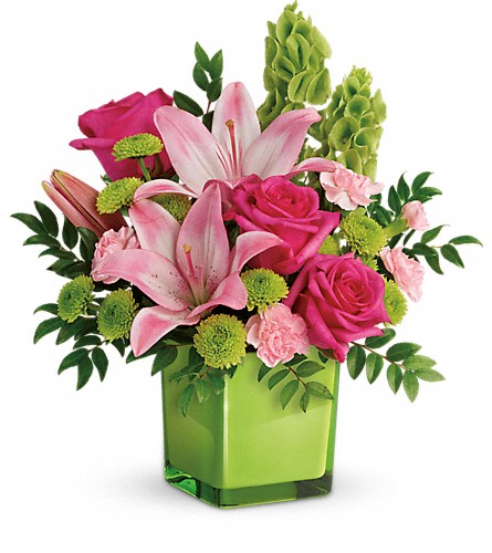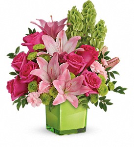 Lime-a-licious! Fresh shades of green are a great way to contrast pink roses and lilies. Hand-delivered in a lovely leaf green cube, it's a loving gift any day of the week!
