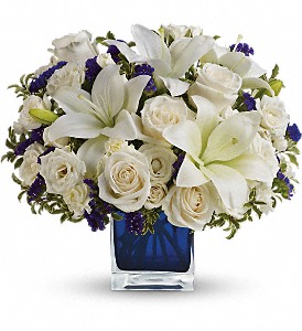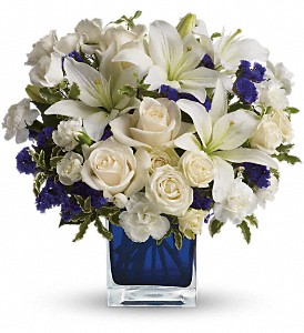 Send someone a bit of heaven with this beautiful bouquet. Luxurious cr�me roses and pure white lilies paint a peaceful picture inside a sapphire blue cube.