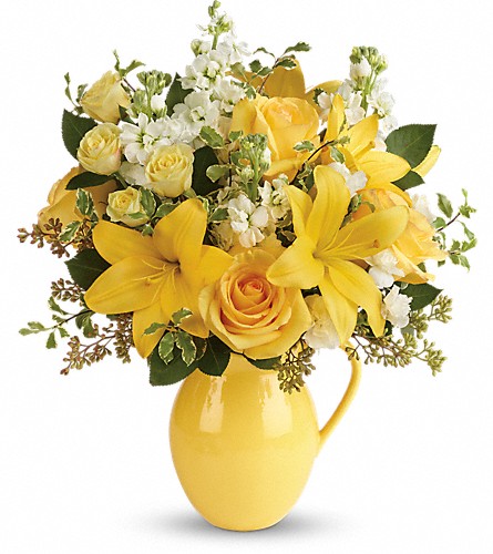 This bright bouquet features yellow roses, yellow spray roses, yellow asiatic lilies, white miniature carnations, white stock, seeded eucalyptus and pitta negra. Delivered in a Sunny Day pitcher. Approximately 16" W x 18" H