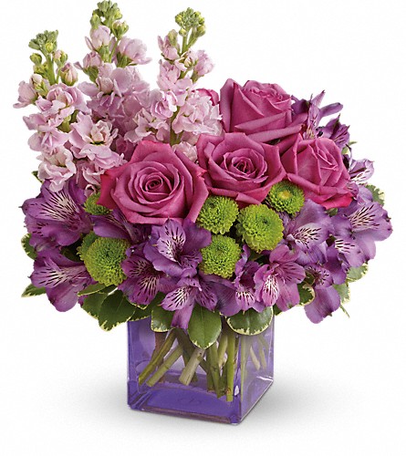 Lavender roses, purple alstroemeria, light pink stock and green button spray chrysanthemums are accented with variegated pittosporum. Delivered in a lavender cube vase. Approximately 12" W x 13 1/2" H