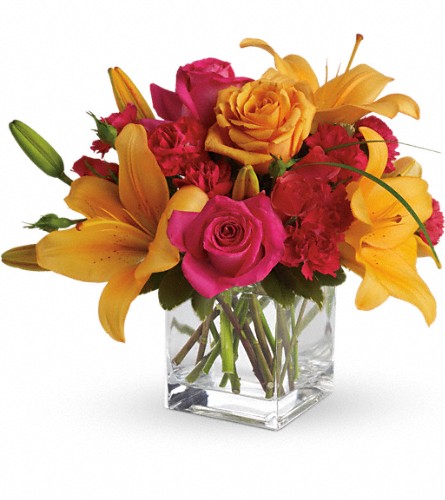 Orange roses, hot pink roses, spray roses and carnations are joined by glowing orange asiatic lilies and bear grass in a delightful vase. This unique arrangement is delivered in a cube but it's definitely not for squares.Approximately 13" W x 11 1/2" H