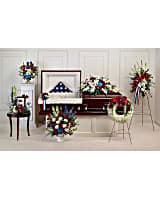 Proud and patriotic, this collection of seven hand-made sympathy pieces honors a life of distinguished service with beautiful arrangements of red, white and blue blooms.