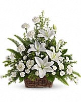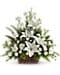 Whether you send this beautiful arrangement to the family home or to the service, all will appreciate its elegance and grace. The contrast of brilliant white blossoms and dazzling greenery create a wonderfully calm and dignified setting.
