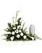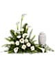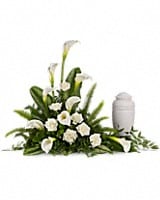 A calming portrait in ivory. Majestic calla lilies and stately white roses are framed by the lush leaves of aspidistra and calathea. Soft green sword fern adds to the soothing tones.